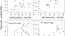 For correlation tests and principal components analysis, we included only data from F2 genotypes, since we were interested in using the variation from this segregating generation to search for underlying relationships between WTF resistance and PA expression. We were not able to test for differences in these relationships between the different generations described in this study because only a limited number of genotypes were included from the parental and F1 generations. However, the parental and F1 plants provided reference points for WFT resistance comparison. We used log-transformed genotypic mean values of feeding damage and PA concentrations to carry out correlation analyses. Either Spearman (for six minor PAs that did not have normally distributed concentrations) or Pearson correlation tests were carried out to test the relationship between feeding damage and the concentrations of individual PAs, pooled concentrations of each of the four PA groups and total PA (see details in Table 2 and Fig. 3).