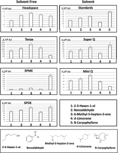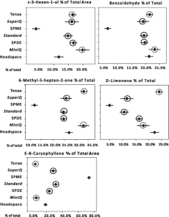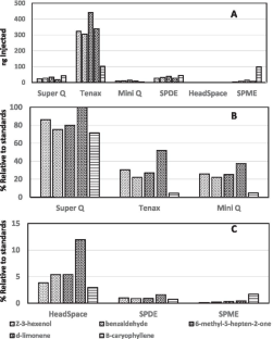 Complex inter-organismal communication among plants, insects, and microbes in natural and agricultural ecological systems is typically governed by emitted and perceived semiochemicals. To understand and ultimately utilize the role of volatile semiochemicals in these interactions, headspace volatiles are routinely collected and analyzed. Numerous collection systems are available (e.g., static or dynamic; adsorption or absorption) where the choice of technique should be dependent upon the plant, insect, or microbial ecological system studied, the information sought, and the limitations of each method. Within these constraints, it remains necessary that each method detects and provides the accurate in situ, or in vitro, volatile profile of the studied system. Herein, we analyzed and compared the pros and cons of three solventless, thermal desorption systems (SPME, Tenax/cold trap, SPDE) using a synthetic standard blend of compounds mimicking a simple natural blend (benzaldehyde, b-caryophyllene, (Z)-3-hexenol, 6-methyl-5-hepten-2-one, and limonene). Direct splitless injection and Super Q collections of the standard blend were used as controls. The results indicated that related qualitative, as well as quantitative differences, could be correlated with adsorbent sampling capacity and structural bias. The results for Tenax/cold trap and SPDE also were affected by sampled headspace volumes. All solventless techniques exhibited high analytical reproducibility, with SPME and SPDE providing ease of use, low cost, and minimal instrument modifications. The more complex Tenax/cold trap technique provided higher collection efficiency. Using these results, we provide guidance for technique selection for chemical communication applications