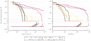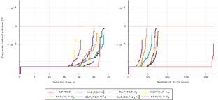 This section of the Appendix presents the performance profiles for the multi-tree and single-tree implementation of the methods included in this manuscript when solving all 358 convex MINLP problems in Problem Set 1. Figures 11 and 12 include the time and iteration performance profiles for the multi-tree implementation, respectively. Figures 13 and 14 include the time and iteration performance profiles for the single-tree implementation, respectively. Notice that we define iterations in the single-tree context as the number of NLP-I problems solved.