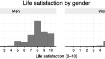 Figure 3 presents the evolution of life satisfaction rated in the SHARE survey on the 10 to 0 scale, again with the time of the partner’s death denoted as time 0. In Fig. 3a, as in Fig. 2, we differentiate between sudden and non-sudden widows. The dynamics of life satisfaction among the widowed sample before sudden widowhood closely matches that of the controls. Among non-sudden widows the match is initially very close, but, as in the case of tearfulness (Fig. 2a), the level of life satisfaction begins to diverge from that of controls much earlier—already around 3 years before the death. The most likely causes of this relative decline are concerns about a partner’s deteriorating condition and the burden of caring obligations. Following the partner’s death, widows unsurprisingly exhibit much reduced satisfaction with their lives. In both groups they evaluate their lives more favorably as time passes; but even after four-and-a-half years of widowhood their life satisfaction remains below that of controls. As late as 3 years following the death of their partner, non-sudden widows have recovered only 50% and sudden widows only 36% of the gap in life satisfaction.