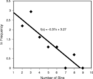 where f(x) is the frequency of genera with observed range-durations of x bins. For Vespertilionoidea, \( R \approx {{FreqRat = 5^2 } \mathord{\left/ {\vphantom {{FreqRat = 5^2 } {\left[ {\left( {38} \right)(8)} \right] = 0.082}}} \right. } {\left[ {\left( {38} \right)(8)} \right] = 0.082}} \).