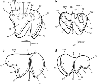 Distribution of enamel in molars: covering the entire crown (0); interrupted at the base of the lingual wall (1); interrupted at the base and the corner of the lingual wall (2); interrupted at the base and in two strips (3); interrupted along the entire labial wall of the upper molars (lingual of the lower molars) except for the flexus/ids opposite to the hyopflexus/id (4); interrupted along the entire lingual wall and anterolingual and posterolingual walls (5).