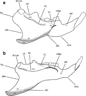 Development of posteroventral projection of the posterior end of the mandibular symphysis in lateral view: well developed, forming an elongate peg exposed in lateral view (0); moderately developed, only a low bulge projects ventrally and is marginally exposed in lateral view (1).