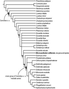The family Caviidae is represented in modern faunas by cavies and maras, whereas the family Hydrochoeridae is represented by capybaras. The evolutionary origin of these families has been related to a diversity of plesiomorphic fossil forms (recorded from the late Oligocene up to the middle Miocene) traditionally grouped in the family “Eocardiidae”. These fossil forms were included, together with Caviidae and Hydrochoeridae, within the Cavioidea s.s. (sensu stricto), because they share high crowned cheek teeth, double-hearted occlusal surface, short lower incisors, and moderate hystricognathy. Within Cavioidea s.s., caviids and hydrochoerids were interpreted as forming its crown group, because they have unique craniomandibular and dental features. In this contribution, a new taxon of Cavioidea s.s. from the middle Miocene of central Patagonia, Argentina, is described, and its phylogenetic position is determined on the basis of a morphological cladistic analysis in which “eocardiids” were included. The study permits the understanding of the sequence of appearance of characters that originated the highly divergent morphology of crown-group cavioids. The analysis of the sequence of appearance of the characters that traditionally diagnosed the crown group indicates that these changes did not occur at the same time. On the contrary, many of these features seem to have appeared at different nodes of the evolutionary history of Cavioidea s.s. The remarkably derived morphology of modern cavioids is the result of a stepwise appearance of a mosaic of evolutionary innovations that originated gradually along the history of Cavioidea during the late-middle Miocene.
