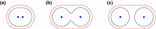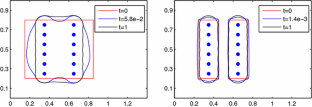 It is easy to see that \(|\lambda _1|<1\) and \(|\lambda _2|<1\). Since a ghost point is a neighbor to a fluid point, at least one of its neighbor needs to be in \(\Omega _+\). We name a neighbor of \(\mathbf{x}\) a check point, if that neighbor point is in \(\Omega _+\). There are totally six different cases for the combination of ghost point and check point: (a) \(\mathbf{x}=\mathbf{x}_{i-1/2,j}\) and \(\phi (\mathbf{x}_{i-1/2+s_1,j})>0\); (b) \(\mathbf{x}=\mathbf{x}_{i-1/2,j}\) and \(\phi (\mathbf{x}_{i-1/2,j+s_2})>0\); (c) \(\mathbf{x}=\mathbf{x}_{i-1/2,j}\) and \(\phi (\mathbf{x}_{i-1/2+s_1/2,j+s_2/2})>0\); (d) \(\mathbf{x}=\mathbf{x}_{i,j-1/2}\) and \(\phi (\mathbf{x}_{i+s_1,j-1/2})>0\); (e) \(\mathbf{x}=\mathbf{x}_{i,j-1/2}\) and \(\phi (\mathbf{x}_{i,j-1/2+s_2})>0\); (f) \(\mathbf{x}=\mathbf{x}_{i,j-1/2}\) and \(\phi (\mathbf{x}_{i+s_1/2,j-1/2+s_2/2})>0\). For each of these cases, we obtain the corresponding \(S(u,\mathbf{x}^*,r)\), \(S(v,\mathbf{x}^*,r)\), and \(S(p,\mathbf{x}^*,r)\) with \(r\in \{1, 2, 3\}\). In Fig. 12, we schematically plot all six cases and the corresponding \(S(u,\mathbf{x}^*,r)\), \(S(v,\mathbf{x}^*,r)\), and \(S(p,\mathbf{x}^*,r)\) for \(r=3\). Notice that for cases (a)–(c), Eq. (6.1) is discretized, and \(S(v,\mathbf{x}^*,r)\) is not needed.