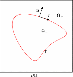 In the appendix, we provide details of the ghost fluid discretization on the interface. First of all, with the notations \(\mathbf{n}=(n_1,n_2)\) and \({\varvec{\tau }}=(-n_2,n_1)\), the traction boundary conditions (2.4) read