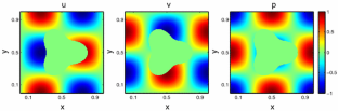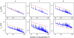 We use this symbolic inverse matrix method to find a third-order scheme for discretizing Eq. (6.1) around \(\mathbf{x}^*\). To find a second-order or first-order scheme, we form a smaller matrix A by applying a second or first-order Taylor expansion to \(u(\mathbf{x}_k)\), \(v(\mathbf{y}_k)\), and \(p(\mathbf{z}_k)\) at \(\mathbf{x}^*\), with \(\mathbf{x}_k\in S(u,\mathbf{x}^*,r)\), \(\mathbf{y}_k\in S(v,\mathbf{x}^*,r)\), and \(\mathbf{z}_k\in S(p,\mathbf{x}^*,r)\), respectively. Using similar computations, we are able to construct the first, second, and third-order schemes for all six cases (a)–(f), but we do not need to record the ten-page formulas here.