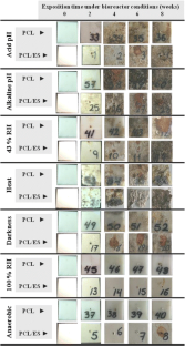 The biodegradation process of a polycaprolactone (PCL)/eggshell (ES) biocomposite (50/50 w/w) was studied for 8 weeks, using a bioreactor, which allowed to control: temperature, moisture, soil pH, light and anaerobic condition during composting. Scanning electron microscopy showed that the degradation process occurred mainly on the sample surface, attributable to the microbial attack and the weight loss showed a higher degradation for the PCL/ES samples than for pure PCL. Viscometric tests showed that the viscosity of the PCL phase in the biocomposite decreased more than when PCL was used alone, due to the higher depolymerization in the biocomposites. Differential scanning calorimetric thermal scans showed that the crystallization temperature changed for 8 weeks. In conclusion, it was noted that soil pH, heat and an aerobic environment accelerate the degradation process, while a photo-controlled, anaerobic and moisture-saturated environment delays this process, as compared with the composting system used as control.