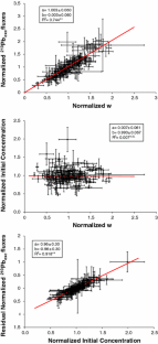 Fig. A-1 Initial 210Pbexc activity versus SAR for cores C1 to C9 (Table 1 and ESM Appendix). Trend lines from the BCES estimator (in boxes, “a” is the slope and R2 the coefficient of determination; N.S means not statistically significant, and * a confidence level >95 %) (PDF 105 kb)