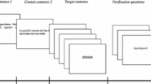 As pointed out above, presuppositions are assumed to be encoded in a lexical trigger according to a semantic view, that is, they are associated with certain words (Frege 1892; Heim 1982; Russell 1905). This view is in line with the prediction that the trigger itself leads to awareness of the importance of context and could thus evoke immediate processing costs. However, there is an alternative theoretical perspective on presuppositions which takes a more pragmatic approach (Stalnaker 1973; Levinson 1983; Simons 2001). It assumes that presuppositions are not semantically encoded but are pragmatic, that is, they only play a role after the sentence’s main meaning is computed and its integration into the context is considered. This “two-step” procedure means that the presupposition is not necessarily processed immediately, but only later at the end of the sentence. How presuppositions arise is still a highly debated issue in the literature (“the triggering problem”). It led to the debate whether presuppositions are needed as a separate concept or whether the issue is better understood in terms of what is at-issue or raises attention versus what is non-at-issue/in the background (Simons et al. 2011; Abrusán 2011; Tonhauser et al. 2018).Footnote 1 So far, there is a lot of evidence supporting the view that presuppositions are processed immediately (see below), which speaks against a two-step process. The data thus suggest that any processing model of presuppositions should contain the trigger itself as an important factor.