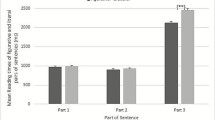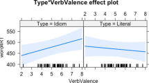 In order to investigate the nature of this interaction in high-literality idioms, biasing context was also recoded (first as figurative context = 0, literal context = 1, subsequently reversed), and the original model was used again, keeping high-literality idioms as the intercept. The results display main effects of resolution type for both literal (β = 0.07, t = 2.04, p < 0.05) and figurative contexts (β = − 0.11, t = − 3.36, p < 0.001) in opposite directions. This finding suggests that, for high-literality idioms, congruently resolving endings were read more quickly than incongruently resolving endings (e.g., “The new schoolboy… wanted to break the ice with his peers…” and “The chilly Eskimo…wanted to break the ice on the lake…” vs. “The new schoolboy… wanted to break the ice on the lake …” and “The chilly Eskimo…wanted to break the ice with his peers …”). While this is a reflection of the marginally significant three-way interaction, these results confirm the trends displayed in the high-literality idioms (right) in Fig. 3.