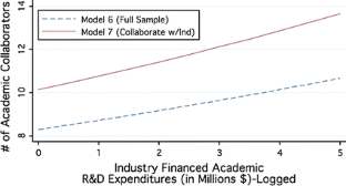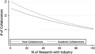 This paper examines the role of the federal government in shaping the relationship between academics scientists and industry. There exists a potential conflict between government policies encouraging collaboration within academia and the policies encouraging collaboration between academia and industry. To test and model these potential conflicts, this paper uses data collected in a 2004–2005 survey by the Research Valuing Mapping Project (a project based at Georgia Tech and led by Barry Bozeman) of more than 2000 academically based research scientists and engineers. The major finding in this paper shows that academic scientists working with industry collaborate more (with all types of collaborators) than those that do not collaborate with industry. However, when examining only those scientist that collaborate with industry, the results reveal a negative relationship between the amount of time spent collaborating with industry and the number of collaborators; implying that increasing collaboration with industry leads to less academic–academic collaboration.
