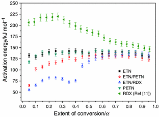 Yan Q-L, Zeman S, Šelešovský J, Svoboda R, Elbeih A. Thermal behavior and decomposition kinetics of Formex-bonded explosives containing different cyclic nitramines. J Therm Anal Calorim. 2012;111:1419–30.