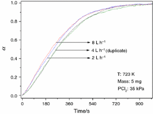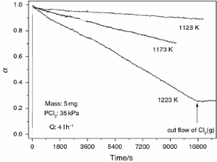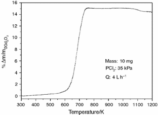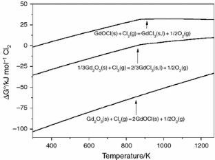 The reaction between Gd2O3(s) and Cl2(g) was studied in a high-resolution thermogravimetric system. The reaction product was GdOCl, which was the unique solid phase produced in all the temperature range studied. The GdOCl is subsequently chlorinated producing GdCl3 for temperatures above 1123 K. The system is under chemical control for temperatures below 723 K. It was found that the reaction order with respect to the chorine partial pressure is 0.77 and the activation energy is 132 kJ mol−1 for the temperature range of 623–723 K. The global rate equation was developed. The GdOCl obtained was characterized by X-ray diffraction, scanning electron microscopy and magnetic measurements. The structure of GdOCl was refined with the Rietveld method, and it crystallized in a tetragonal form of REOX possessing the Matlockite-type (PbFCl) structure. The magnetic measurements indicated that the sample is paramagnetic at all the measurement ranges. The parameters of the Curie–Weiss law obtained were as follows: θ = −12.0 K, C = 7.9592 emu K mol−1 and µ eff = 7.98µ B.