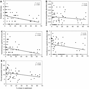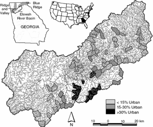The authors would like to thank the numerous people with the Freeman lab at the University of Georgia and the Stream Survey Team with the Georgia Department of Natural Resources for making this project possible by collecting fish data and maintaining an informative fish database. P. Johnson, C. Straight, and S. Wenger provided fish database and GIS support. J. Lee and E. Kramer from the Natural Resources Spatial Analysis Laboratory (NARSAL) at the University of Georgia provided land cover and impervious surface cover maps. Funding for this project was provided by a US Fish & Wildlife Service Habitat Conservation Planning Grant awarded to the Georgia Department of Natural Resources, and by a University of Georgia Dissertation Writing Fellowship awarded to A.H.R.