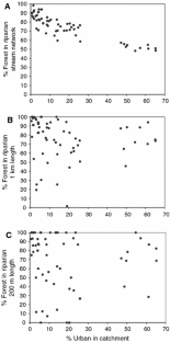 We assessed the influence of land cover at multiple spatial extents on fish assemblage integrity, and the degree to which riparian forests can mitigate the negative effects of catchment urbanization on stream fish assemblages. Riparian cover (urban, forest, and agriculture) was determined within 30 m buffers at longitudinal distances of 200 m, 1 km, and the entire network upstream of 59 non-nested fish sampling locations. Catchment and riparian land cover within the upstream network were highly correlated, so we were unable to distinguish between those variables. Most fish assemblage variables were related to % forest and % urban land cover, with the strongest relations at the largest spatial extent of land cover (catchment), followed by riparian land cover in the 1-km and 200-m reach, respectively. For fish variables related to urban land cover in the catchment, we asked whether the influence of riparian land cover on fish assemblages was dependent on the amount of urban development in the catchment. Several fish assemblage metrics (endemic richness, endemic:cosmopolitan abundance, insectivorous cyprinid richness and abundance, and fluvial specialist richness) were all best predicted by single variable models with % urban land cover. However, endemic:cosmopolitan richness, cosmopolitan abundance, and lentic tolerant abundance were related to % forest cover in the 1-km stream reach, but only in streams that had <15% catchment urban land cover. In these cases, catchment urbanization overwhelmed the potential mitigating effects of riparian forests on stream fishes. Together, these results suggest that catchment land cover is an important driver of fish assemblages in urbanizing catchments, and riparian forests are important but not sufficient for protecting stream ecosystems from the impacts of high levels of urbanization.