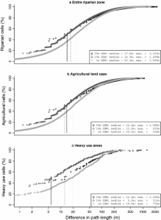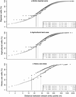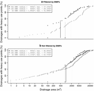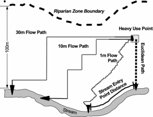 Riparian buffers, a best management practice (BMP), lessen environmental impacts caused by pasture-based agriculture by excluding livestock from streams and removing sediment and nutrients from overland flow before they enter the watercourse. Geospatial data analysis of digital elevation models (DEMs) can improve BMP placement by ensuring that BMPs intercept flow paths. Livestock heavy use areas and riparian buffers within 100 m of the stream were digitized using aerial photography of Spring Creek watershed (Pennsylvania, USA). Flow path lengths and stream entry points from heavy use areas, from all agricultural land uses, and from a random sample of points were calculated using 1, 10, and 30 m DEM resolutions. Euclidean distances identified the nearest stream entry point regardless of topography. Drainage areas for each streambank cell were evaluated using each DEM resolution. Topographic calculations differed significantly from Euclidean, with median differences of 14.3 m for flow path length and 24.1 m between stream entry points for the 10 m DEM. Existing buffers intercepted runoff from only 23 % of heavy use areas. Drainage areas ranged from one to hundreds of DEM cells. Any DEM is an arbitrary representation of a continuous surface; both resolution and processing method affect the suitability of such a representation for any given purpose. We found that 30 m DEMs did not provide reasonable flow path estimates at the scale of grazing agriculture in this region, while Pennsylvania 1 m DEMs were minimally smoothed during DEM preparation, resulting in erratic flow paths. The 10 m DEMs were the most suitable available DEM product, and should be used in conjunction with site visits for planning pasture BMP placement.