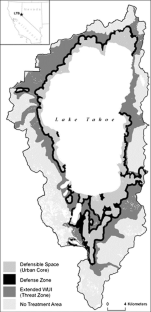 We thank the Lake Tahoe Basin agency personnel who participated in workshops and provided data and guidance throughout the project. We also thank Alison Stanton, consultant at South Lake Tahoe, CA, Jian Yang, scientist at the Chinese Academy of Sciences, Tom Dilts, spatial analyst at the Department of Natural Resources and Environmental Science, University of Nevada-Reno, and Carl Skinner, geographer at the Pacific Southwest Research Station, USDA Forest Service for their hard work and support throughout this project. Funding was provided by the Southern Nevada Public Land Management Act (Grant No. 10 DG-11272170-038), Bureau of Lands Management (P049, P086) and in part by the Strategic Environmental Research and Development Program of the Department of Defense (RC-2243). We thank the Forestry Sciences Laboratory, Southern Research Station, USDA Forest Service, Athens, GA, USA, for their support.