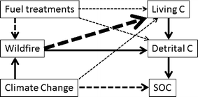 We used a simulation modeling approach that couples a landscape model of forest disturbance and succession with an ecosystem model of carbon dynamics (Century), to quantify the interacting effects of climate change, fuel treatments and wildfire for carbon storage potential in a mixed-conifer forest in the western USA.