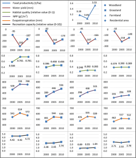 Water yield decreased significantly, and habitat quality, net primary productivity, and evapotranspiration increased significantly across different land use types from 2000 to 2005. The synergy between food productivity and water yield, and the trade-off between water yield and evapotranspiration, greatly reduced from 2000 to 2010 at the pixel scale. Water yield was a trade-off to habitat quality, NPP, and recreation capacity in 2000 at the pixel scale while a synergy to the three services in 2010. The synergies between habitat quality and NPP, evapotranspiration, and recreation capacity at the pixel scale were enhanced from 2000 to 2010. Changes in the direction or significance of correlations among ecosystem services were observed across the pixel and town scales in 2000 and 2010.