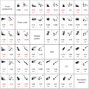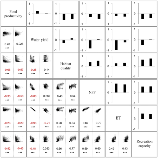 We calculated six ecosystem services of the Baota District on the central Loess Plateau of China for 2000, 2005, and 2010. Furthermore, we quantified the interactions among these services at the beginning and after the end of the first phase of the Grain for Green Program in this area, and across the pixel scale of 1 km2 and the town scale.