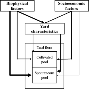We analyzed plant species richness and phylogenetic composition of cultivated and spontaneous flora of 117 private yards from six major metropolitan areas in the US. Yard plant species richness and phylogenetic composition were expressed as a function of biophysical and socioeconomic variables and yard characteristics using linear mixed-effects models and spatially explicit structural equation modeling.