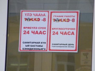 Zaripova (2012: 29–31) discusses a similar situation in Ufa, Bashkortostan, where many (but not all) businesses had Bashkir names and even informative signs (e.g. opening hours) presented bilingually in Bashkir and Russian, but all other signage—especially advertising—was presented in Russian.