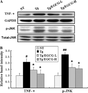 Alzheimer’s disease (AD) fundamentally represents a metabolic disease associated with brain insulin resistance. TNF-α/c-Jun N-terminal kinase (JNK) signaling plays a central role in serine phosphorylation of insulin receptor substrate-1 (IRS-1). (−)-Epigallocatechin-3-gallate (EGCG), a potent antioxidant, has been verified to attenuate peripheral insulin resistance by reducing IRS-1 signaling blockage. This study aimed to investigate the effects and possible mechanisms of EGCG on central IRS-1 signaling in vivo. APP/PS1 mice were treated with EGCG, and spatial memory was assessed by the Morris water maze test. Levels of soluble and insoluble Aβ42 in the hippocampus were determined by ELISA. The activation of NF-α/JNK and IRS signaling was detected by immunohistochemistry and Western blot analysis. Our results showed that EGCG ameliorated the impaired learning and memory in APP/PS1 mice. Notably, we found a significant reduction of IRS-1pS636 level accompanied with decreased Aβ42 levels in the hippocampus of 13-month-old female APP/PS1 mice after treatment with EGCG (2 or 6 mg/kg/day) for 4 weeks. Furthermore, EGCG treatment inhibited TNF-α/JNK signaling and increased the phosphorylation of Akt and glycogen synthase kinase-3β in the hippocampus of APP/PS1 mice. In conclusion, our study provides evidence that long-term consumption of EGCG may alleviate AD-related cognitive deficits by effectively attenuating central insulin resistance.