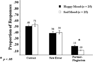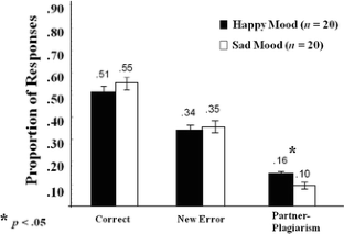 Six participants’ data (two happy and four sad) were not included in this analysis because they did not make any errors in the Generate-New phase, hence the proportion of errors that were partner-plagiarisms or self-plagiarisms could not be calculated.