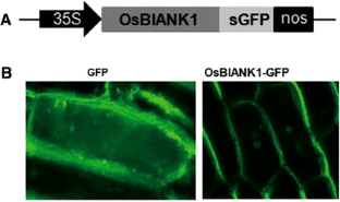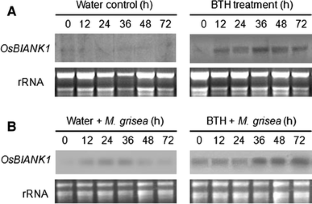 A rice gene, OsBIANK1, encoding a protein containing a typical ankyrin repeat domain, was cloned and identified. The OsBIANK1 protein, consisting of 329 amino acids, contains a conserved ankyrin repeat domain with two ankyrin repeats organized in tandem and was showed to be localized on cytoplasmic membrane during transient expression in onion epidermal cells. Expression of OsBIANK1 was induced by treatment with benzothiadiazole (BTH), a chemical inducer capable of inducing disease resistance response in rice. In BTH-treated rice seedlings, expression of OsBIANK1 was further induced by infection with Magnaporthe grisea, the rice blast fungus, as compared with those in water-treated seedlings. Our preliminary results confirm previous evidences that OsBIANK1 may be involved in regulation of disease resistance response in rice.