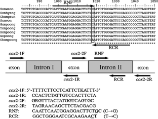 Korean ginseng (Panax ginseng) has been developed as a horticultural crop due to the increasing demand in the world market. “Chunpoong” is an economically important cultivar with superior quality and high yield among nine cultivars of Korean ginseng. The aim of this work was to develop a simple technique for specific authentication of Chunpoong using DNA method. Molecular authentication of Chunpoong was investigated using DNA sequences of mitochondrial cytochrome oxidase subunit 2 (cox2) intron I and intron II regions. A single nucleotide polymorphism (SNP) specific to Chunpoong was detected and amplification refractory mutation system (ARMS)-PCR method was applied to specific identification of Chunpoong based on the SNP site. Ginseng samples collected from other locations were used to validate the SNP marker and the established method was determined to be effective. Thus, this work provides a rapid and reliable method for the specific identification of Chunpoong cultivar.