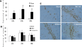 To demonstrate the protective effects of Calpeptin as the Calpain inhibitor against focal cerebral ischemia–reperfusion injury in rats and to explore it’s possible mechanism. 96 rats were randomly divided into four groups. The model of middle cerebral artery occlusion was used for the research of focal cerebral ischemia. Using this animal model, the effects of Calpeptin on the neurological functions, infarction volume and infarction volume percentage of brain, Caspase-3 expression and neuronal apoptosis in hippocampal CA1 sector after focal cerebral ischemia–reperfusion injury in rats were investigated. The current results confirmed that Calpeptin as the Calpain inhibitor might paly an important role for neuroprotection against focal cerebral ischemia–reperfusion injury. Calpeptin could reduce the neuronal apoptosis in hippocampal CA1 sector when the rats was subjected to the focal cerebral ischemia–reperfusion, the potential mechanism might be related to the inhibition of the expression of Caspase-3 by Calpeptin. However, it is still unknown to what the exact mechanism of Calpeptin inhibits the activation of Caspase-3 in this process. Therefore, further research needs to be done to unravel the underlying mechanisms in the future.