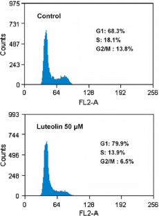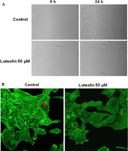 Luteolin, 3′,4′,5,7-tetrahydroxyflavone, has been shown to possess antioxidant, anti-inflammation and anti-cancer properties. However, its role in lung cancer remains poorly understood. Here we examined the anti-tumorigenic role of luteolin in a commonly used lung cancer cell line. Luteolin inhibited the growth of A549 cells by inducing G1 phase cell cycle arrest and apoptosis. Furthermore, stress fiber assembly and cell migration in A549 cells was markedly suppressed by luteolin.