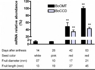 The tropical tree Bixa orellana L. produces a range of secondary metabolites which biochemical and molecular biosynthesis basis are not well understood. In this work we have characterized a set of ESTs from a non-normalized cDNA library of B. orellana seeds to obtain information about the main developmental and metabolic processes taking place in developing seeds and their associated genes. After sequencing a set of randomly selected clones, most of the sequences were assigned with putative functions based on similarity, GO annotations and protein domains. The most abundant transcripts encoded proteins associated with cell wall (prolyl 4-hydroxylase), fatty acid (acyl carrier protein), and hormone/flavonoid (2OG-Fe oxygenase) synthesis, germination (MADS FLC-like protein) and embryo development (AP2/ERF transcription factor) regulation, photosynthesis (chlorophyll a–b binding protein), cell elongation (MAP65-1a), and stress responses (metallothionein- and thaumatin-like proteins). Enzymes were assigned to 16 different metabolic pathways related to both primary and secondary metabolisms. Characterization of two candidate genes of the bixin biosynthetic pathway, BoCCD and BoOMT, showed that they belong, respectively, to the carotenoid-cleavage dioxygenase 4 (CCD4) and caffeic acid O-methyltransferase (COMT) families, and are up-regulated during seed development. It indicates their involvement in the synthesis of this commercially important carotenoid pigment in seeds of B. orellana. Most of the genes identified here are the first representatives of their gene families in B. orellana.