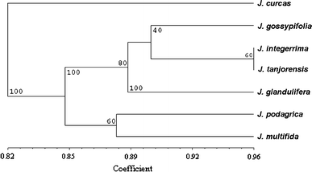 The present investigation was undertaken with an aim to check the ability of cross species amplification of microsatellite markers isolated from Jatropha curcas—a renewable source of biodiesel to deduce the generic relationship with its six sister taxa (J. glandulifera, J. gossypifolia, J. integerrima, J. multifida, J. podagrica, and J. tanjorensis). Out of the 49 markers checked 31 markers showed cross species amplification in all the species studied. JCDS-30, JCDS-69, JCDS-26, JCMS-13 and JCMS-21 amplified in J. curcas. However, these markers did not show any cross species amplification. Overall percentage of polymorphism (PP) among the species studied was 38% and the mean genetic similarity (GS) was found to be 0.86. The highest PP (24) and least GS (0.76) was found between J. curcas/J. podagrica and J. curcas/J. multifida and least PP (4.44) and highest GS (0.96) was found between J. integerrima/J. tanjorensis. Dendrogram analysis showed good congruence to RAPD and AFLP than nrDNA ITS data reported earlier. The characterized microsatellites will pave way for intraspecies molecular characterization which can be further utilized in species differentiation, molecular identification, characterization of interspecific hybrids, exploitation of genetic resource management and genetic improvement of the species through marker assisted breeding for economically important traits.