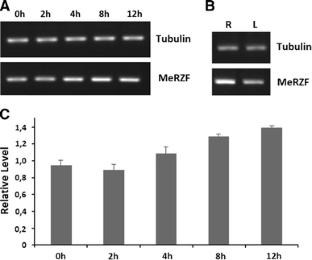 Cassava (Manihot esculenta Crantz) is one of the world’s most important food crops. It is cultivated mainly in developing countries of tropics, since its root is a major source of calories for low-income people due to its high productivity and resistance to many abiotic and biotic factors. A previous study has identified a partial cDNA sequence coding for a putative RING zinc finger in cassava storage root. The RING zinc finger protein is a specialized type of zinc finger protein found in many organisms. Here, we isolated the full-length cDNA sequence coding for M. esculenta RZF (MeRZF) protein by a combination of 5′ and 3′ RACE assays. BLAST analysis showed that its deduced amino acid sequence has a high level of similarity to plant proteins of RZF family. MeRZF protein contains a signature sequence motif for a RING zinc finger at its C-terminal region. In addition, this protein showed a histidine residue at the fifth coordination site, likely belonging to the RING-H2 subgroup, as confirmed by our phylogenetic analysis. There is also a transmembrane domain in its N-terminal region. Finally, semi-quantitative RT-PCR assays showed that MeRZF expression is increased in detached leaves treated with sodium chloride. Here, we report the first evidence of a RING zinc finger gene of cassava showing potential role in response to salt stress.