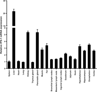 IFN-β promoter stimulator 1 (IPS-1) is an important adaptor protein linking RIG-I/MDA5 to the downstream signaling molecules and plays the pivotal role in type I interferons induction. In this study, we cloned and characterized Tibetan porcine IPS-1, investigated the tissue distribution, compared different messenger RNA expression for IPS-1 between Tibetan and Crossbred (Duroc × Yorkshire × Landrace) pigs (DLY). The Tibetan porcine IPS-1 gene was first cloned from spleen. The entire open reading frame (ORF) of the IPS-1 is 1,575 bp and encodes for 524 amino acid residues, has 1 putative transmembrane domains, with a higher degree of sequence similarity with common pig (99.37%) and cattle (81.23%) than with human (70.20%) or mouse (63.44%). Real-time quantitative PCR analysis indicated that Tibetan porcine IPS-1 mRNA was most abundant in the liver and kidney. The expression of IPS-1 of Tibetan pigs in most tissues was higher than DLY pigs.