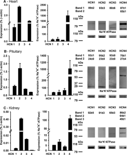 Hyperpolarization-activated cyclic nucleotide-gated (HCN) channels play a critical role in a broad range of cell types, but the expression of the various HCN isoforms is still poorly understood. In the present study we have compared the expression of HCN isoforms in rat excitable and non-excitable tissues at both the mRNA and protein levels. Real-time PCR and Western blot analysis revealed distinct expression patterns of the four HCN isoforms in brain, heart, pituitary and kidney, with inconsistent mRNA-protein expression correlation. The HCN2 was the most abundant mRNA transcript (95.6, 78.0 and 59.0 % in kidney heart and pituitary, respectively) except in the brain (42.0 %) whereas HCN4 was the most abundant protein isoform. Our results suggest that HCN channels are mostly produced by the HCN4 isoform in heart, which contrasts with the sharp differences in the isoform stoichiometry in pituitary (15 HCN4:2 HCN2:1 HCN1:1 HCN3), kidney (24 HCN4:2 HCN3:1 HCN2:1 HCN1) and brain (3 HCN4:2 HCN2:1 HCN1:1 HCN3). Moreover, deviations of the electrophoretic molecular weight (MW) of the HCN isoforms relative to the theoretical MW were observed, suggesting that N-glycosylation and enzymatic proteolysis influences HCN channel surface expression. We hypothesize that selective cleavage of HCN channels by membrane bound metalloendopeptidases could account for the multiplicity of properties of native HCN channels in different tissues.