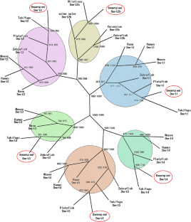 The swamp eel is a teleost fish with a characteristic of natural sex reversal and an ideal model for vertebrate sexual development. However, underlying molecular mechanisms are poorly understood. We report the identification of five DM (doublesex and mab-3) domain genes in the swamp eel that include Dmrt2, Dmrt2b, Dmrt3, Dmrt4 and Dmrt5, which encode putative proteins of 527, 373, 471, 420 and 448 amino acids, respectively. Phylogenetic tree showed that these genes are clustered into corresponding branches of the DM genes in vertebrates. Southern blot analysis indicated that the Dmrt1–Dmrt3–Dmrt2 genes are tightly linked in a conserved gene cluster. Notably, these Dmrt genes are up-regulated during gonad transformation. Furthermore, mRNA in situ hybridisation showed that Dmrt2, Dmrt3, Dmrt4 and Dmrt5 are expressed in developing germ cells. These results are evidence that the DM genes are involved in sexual differentiation in the swamp eel.