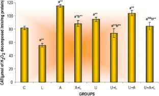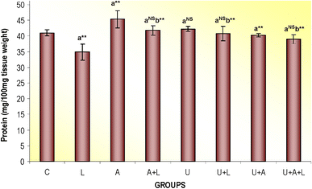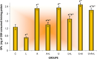 The study aimed to evaluate the effect of cow urine and combination of antioxidants against lindane induced oxidative stress in Swiss mice. Male healthy mice, 8–10 weeks old, weighing 30 ± 5 g were randomly selected and divided into eight groups, namely, control (C); lindane (L); antioxidant (A), antioxidant+lindane (A+L), cow urine (U), cow urine+lindane (U+L), cow urine+antioxidants (U+A) and cow urine+antioxidants+lindane (U+A+L). Group C animals were administered only the vehicle (olive oil); doses selected for other treatments were: lindane: 40 mg/kg b.w.; antioxidants: 125 mg/kg b.w. (vitamin C: 50 mg/kg b.w., vitamin E: 50 mg/kg b.w., α-lipoic acid: 25 mg/kg b.w.) and cow urine: 0.25 ml/kg b.w. In group A+L and U+L antioxidants and cow urine were administered 1 h prior to lindane administration and in group U+A and U+A+L cow urine was administered 10 min before antioxidants. All treatments were administered orally continuously for 60 days. Lindane treated group showed increased lipid peroxidation, whereas glutathione, glutathione peroxidase, superoxide dismutase, catalase, protein and endogenous levels of vitamin C and E were significantly decreased compared to control. Administration of cow urine and antioxidants alleviated the levels of these biochemical parameters.
