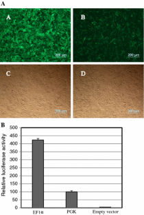 The promoter plays an important role in the regulation of gene expression. To analyze a promoter’s activity, we developed a novel lentiviral T/A vector that contains two reporter genes, a luciferase (Luc2) gene and a green fluorescent protein (Venus) gene, that are linked via an internal ribosome entry site (IRES2). To test the performance of this vector, phosphoglycerate kinase-1 (PGK) and elongation factor-1α (EF1α) promoters were amplified by PCR and inserted into this lentiviral T/A vector using T4 DNA ligase, yielding two promoter–reporter vectors: pLent-T-PGK and pLent-T-EF1α. When these vectors were transfected into 293T cells, we observed a higher level of Venus expression under a fluorescence microscopy in the case of pLent-T-EF1α as compared to pLent-T-PGK. The results of the luciferase reporter assay showed that the ratio of the promoter activities of EF1α and PGK was approximately 9:1. The two promoter–reporter vectors were also packaged as lentiviral particles to conduct promoter activity assay in cultured cells. The ratio of the promoter activities of EF1α and PGK was 4.23:1 when they were infected into 293T cells at a multiplicity of infection of 1. This value is comparable to that of a parallel experiment using the commercial luciferase reporter vector pGL4.10 with an activity ratio of 5.99:1 for EF1α and PGK. These results indicate that lentiviral T/A vector will be a useful tool for analysis of promoter activity and specificity.