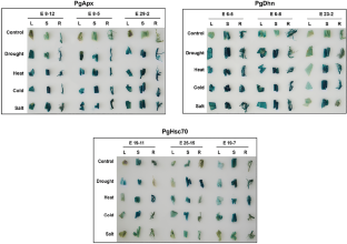 Pearl millet is a C4 cereal crop that grows in arid and semi-arid climatic conditions with the remarkable abiotic stress tolerance. It contributed to the understanding of stress tolerance not only at the physiological level but also at the genetic level. In the present study, we functionally cloned and characterized three abiotic stress-inducible promoters namely cytoplasmic Apx1 (Ascorbate peroxidase), Dhn (Dehydrin), and Hsc70 (Heat shock cognate) from pearl millet. Sequence analysis revealed that all three promoters have several cis-acting elements specific for temporal and spatial expression. PgApx pro, PgDhn pro and PgHsc70 pro were fused with uidA gene in Gateway-based plant transformation pMDC164 vector and transferred into tobacco through leaf-disc method. While PgApx pro and PgDhn pro were active in seedling stages, PgHsc70 pro was active in stem and root tissues of the T2 transgenic tobacco plants under control conditions. Higher activity was observed under high temperature and drought, and less in salt and cold stress conditions. Further, all three promoters displayed higher GUS gene expression in the stem, moderate expression in roots, and less expression in leaves under similar conditions. While RT-qPCR data showed that PgApx pro and PgDhn pro were expressed highly in high temperature, salt and drought, PgHsc70 pro was fairly expressed during high temperature stress only. Histochemical and RT-qPCR assays showed that all three promoters are inducible under abiotic stress conditions. Thus, these promoters appear to be immediate candidates for developing abiotic stress tolerant crops as these promoter-driven transgenics confer high degree of tolerance in comparison with the wild-type (WT) plants.