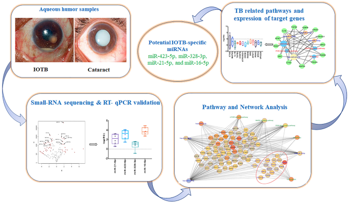 In total, we identified 56 differentially expressed miRNAs in the AH of intraocular tuberculosis (IOTB) patients compared to controls. We selected four significantly dysregulated miRNAs (miR-423-5p, miR-328-3p, miR-21-5p, and miR-16-5p) based on the RT-qPCR validation and predicted their gene targets. We developed a miRNA-targets regulatory network by combining pathways of interest and genes associated with TB. We identified that these four miRNAs might play an important role in IOTB pathogenesis via tuberculosis-associated pathways; PI3K-Akt signaling, autophagy and MAPK pathway.