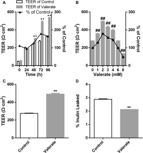 In the present study, valerate, a SCFAs mainly converted from proteins or amino acids, was demonstrated to promote intestinal barrier function at its physiological concentrations of 0–4 mM in the Caco-2 cell monolayer model of intestinal barrier using transepithelial electrical resistance (TEER) assay and paracellular permeability assay. Valerate achieved the maximum increase in the TEER at 2 mM and reduced the paracellular permeability. Its intestinal barrier function promoting activity is similar to that of butyrate, with a broader range of effective concentrations than the later. Through western blot analysis, this activity is linked to the valerate-induced AMPK activation and tight junctions (TJs) assembly, but not to the reinforced expression of TJs related proteins.