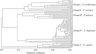 Fusarium species are dominant within the sorghum grain mold complex. Some species of Fusarium involved in grain mold complex produce mycotoxins, such as fumonisins. An attempt was made to identify Fusarium spp. associated with grain mold complex in major sorghum-growing areas in India through AFLP-based grouping of the isolates and to further confirm the species by sequencing part of α-Elongation factor gene and comparing the sequences with that available in the NCBI database. The dendrogram generated from the AFLP data clustered the isolates into 5 groups. Five species of Fusarium—F. proliferatum, F. thapsinum, F. equiseti, F. andiyazi and F. sacchari were identified based on sequence similarity of α-Elongation factor gene of the test isolates with those in the NCBI database. Fusarium thapsinum was identified as predominant species in Fusarium—grain mold complex in India and F. proliferatum as highly toxigenic for fumonisins production. Analysis of molecular variance (AMOVA) revealed 54% of the variation in the AFLP patterns of 63 isolates was due to the differences between Fusarium species, and 46% was due to differences between the strains within a species.