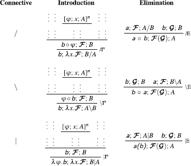 To aid the reader’s understanding, we’d like to point out here that the Introduction rules, especially the one for the non-directional slash | that we introduce below, loosely correspond to Move in Minimalism. There are, however, two important caveats. First, conceptually, the Introduction rules in TLCG are inference rules in the deductive system, which means that they, together with the Elimination rules, define the properties of the connectives /, ∖and |, just as the rules in natural deduction formulations of standard logics (such as propositional logic) define the (proof-theoretic) properties of conjunction, implication and other connectives. For this reason, the ‘grammar rules’ in TLCG have very different statuses from ‘corresponding’ rules in other theories. Second, and relatedly, there is also a (by no means trivial) empirical difference as well, which the metaphorical allusion to Merge and Move might obscure: since these rules are not rules for structure building and structure manipulation, having the Introduction and Elimination rules in TLCG as inference rules has a different consequence than having Merge and Move in a derivational setup, a point which we return to below.