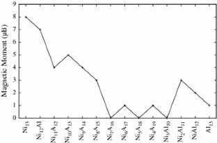 We report the magnetic properties of small \(\hbox{Ni}_{13-n}\hbox{Al}_n\) clusters with n = 0–13 calculated in the framework of density functional theory. The cluster magnetic moment decreases with the sequential substitution of Ni by Al atoms, which can be attributed to a greater degree of hybridization that forces the pairing of the electrons in the molecular orbitals of Ni and Al. For Ni7Al6, the complete quenching of the cluster magnetic moment appears to be due to the antiferromagnetic alignment of atomic spins as revealed by the spin density plots.