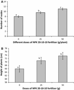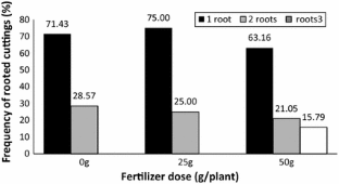 Our study addressed the effect of granular NPK 20-10-10 doses (0, 25 and 50 g/plant) applied to A. floribunda stockplants on growth of stockplant and the effect on rooting ability of foliar NPKs (15-15-30, 20-20-20 and 30-10-10) applied on leafy stem cuttings in propagators at different physiological stages of rooting process (setting, callus initiation and both). Results show that fertilizer doses significantly (p = 0.03) affect the number of cuttings that could be produced by stockplants 6 months after application. The mean number of cuttings per plant increased with fertilizer doses with the highest value of 11.06 ± 0.41 % for 50 g. Application of NPK 20-20-20 foliar fertilizer on stem cuttings at callus stage, significantly (p = 0.04) boosted rooting of stem cuttings after 28 weeks (85.71 ± 4.1 %). Number of roots per cutting was not significantly different (p = 0.98). However, the highest frequency of cuttings displayed three roots was observed on NPK 20-20-20 (To + Cal) and NPK 30-10-10 (To + Cal). From this study, we can conclude that, 50 g of NPK 20-10-10 fertilizer application on stockplants produced the greatest number of vegetal material. Treated with NPK 20-20-20 at callus initiation stage or both (i.e. at setting and at callus initiation stage), rooting performs better.