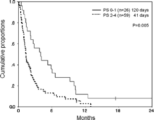 Background Leptomeningeal metastasis (LM) occurs in 4–15% of patients with solid tumors. Although the clinical outcomes in cancer patients have been improving recently, no standard treatment for LM has been established as yet. The purpose of this study was to identify the prognostic factors in patients with solid tumors with cytologically proven LM. Methods We retrospectively analyzed a series of 85 consecutive patients with cytologically proven LM who were treated between 1997 and 2005. Results The primary diseases were as follows; lung cancer (n = 36), breast cancer (n = 33), gastric cancer (n = 8), and others (n = 8). Forty-nine patients had brain metastasis at the time of diagnosis of the LM, and in 51 patients, MRI revealed meningeal dissemination in the brain or spine. The performance status (PS) was 0–1 in 26 patients and 2–4 in 59 patients. Thirty-one patients, including 19 with breast cancer, four with lung cancer, five with gastric cancer and three with other cancers, were treated by intrathecal (IT) chemotherapy. The response rate to the IT was 52% (95% confidence interval (CI): 41.4–62.6%). The median survival was 51 days (range, 3–759 days). A univariate analysis identified breast cancer, good PS (0–1), time to development of the LM (>1 year), and treatment by IT chemotherapy as being associated with a good prognosis, and multivariate analysis identified poor PS (HR: 1.72 (95% CI, 1.04–2.86) P = 0.04) and MRI-proven LM (HR: 1.82 (95% CI, 1.11–2.98) P = 0.02) as being associated with a poor prognosis. Conclusion In patients with poor prognostic factors, such as poor PS or MRI-proven LM, palliative therapy might be the most suitable treatment strategy.