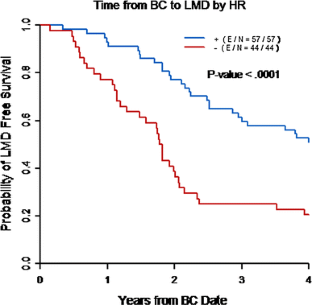Leptomeningeal disease (LMD) occurs in 5 % of breast cancer patients. The aim of this study was to identify risk factors related to survival and time to development of LMD in breast cancer patients. A retrospective analysis of breast cancer patients with LMD, evaluated in MDACC between 1995 and 2011. 103 patients with diagnosis of breast cancer and LMD were identified (one male). The median age at LMD diagnosis was 49.2 years. 78.2 % had invasive ductal carcinoma. Hormone receptors (HRs) were positive in 55.3 % of patients, 47.4 % were human epidermal growth factor receptor 2-positive and 22.8 % were triple negative. 52 % of the patients were treated with WBRT, 19 % with spinal radiation, 36 % with systemic chemotherapy and 55 % with intrathecal chemotherapy. Estimated median overall survival from time of breast cancer diagnosis was 3.66 years. Median survival from time of LMD diagnosis was 4.2 months. Time from breast cancer diagnosis to LMD was 2.48 years. In multivariate analysis, HR status and stage at diagnosis were significantly associated with time to LMD diagnosis (p < 0.05). In triple negative patients, time to LMD was shorter. In patients who were HR positive, time to LMD was longer. Survival from LMD diagnosis was significantly associated with both treatment, as well as positive HR status (multivariate analysis p < 0.05). In conclusion LMD has dismal prognosis in breast cancer patients. HR status contributes to time to LMD diagnosis and survival from LMD diagnosis. The impact of treatment aimed at LMD cannot be ascertained in our retrospective study due to the inherent bias associated with the decision to treat.